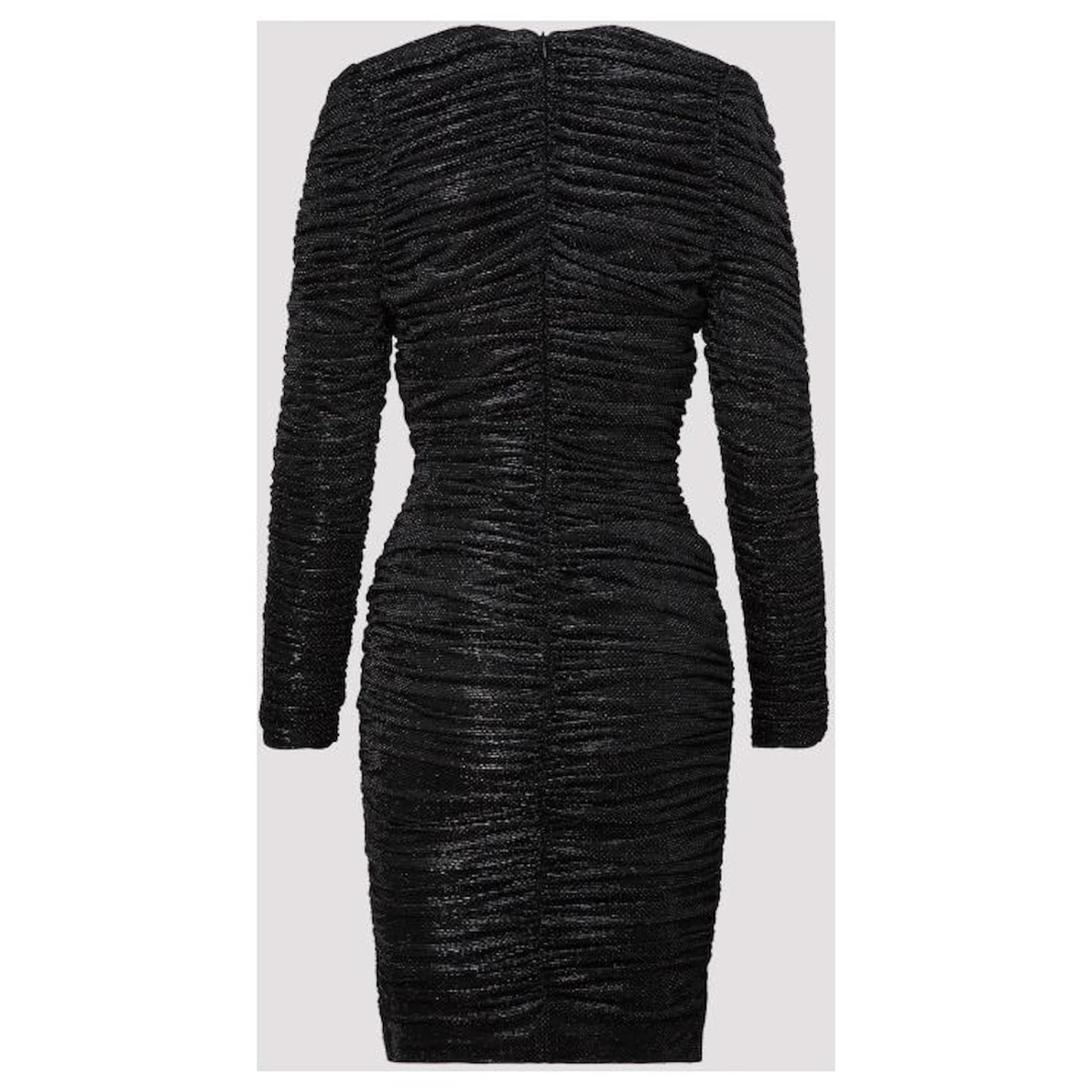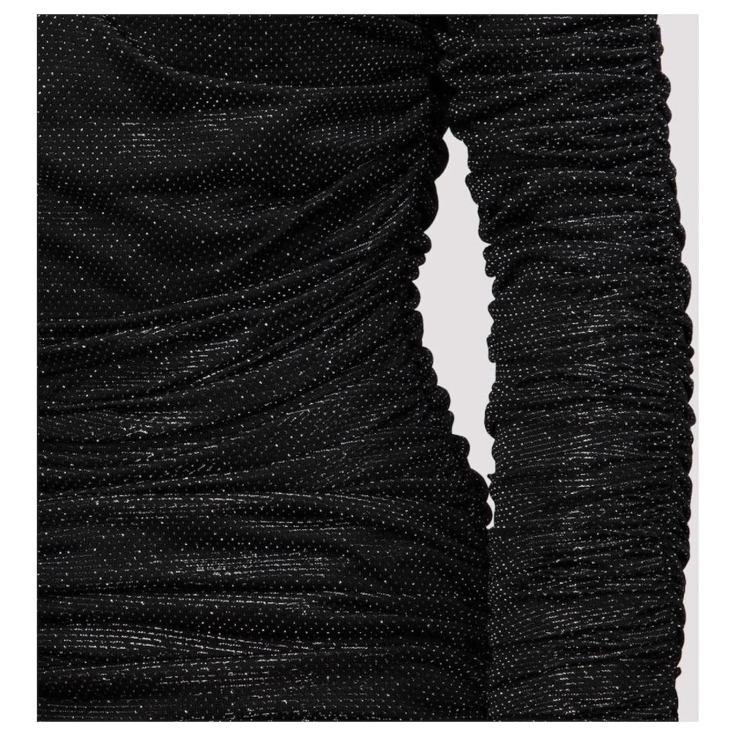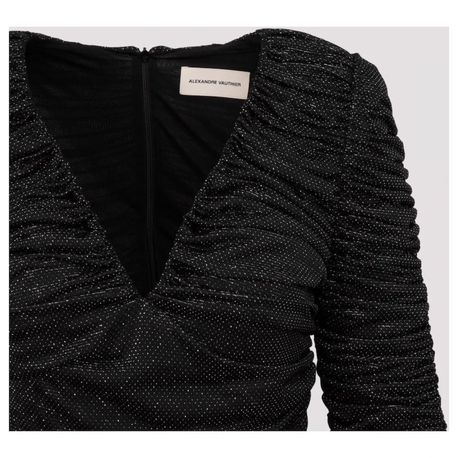 Robe noire drapée en V Alexandre Vauthier. Mélange de viscose drapé noir avec empiècements en lurex, Décolleté en V, épaules rembourrées, manches longues, fermeture zippée au dos, Courte longueur, Fully lined, Coupe extensible.