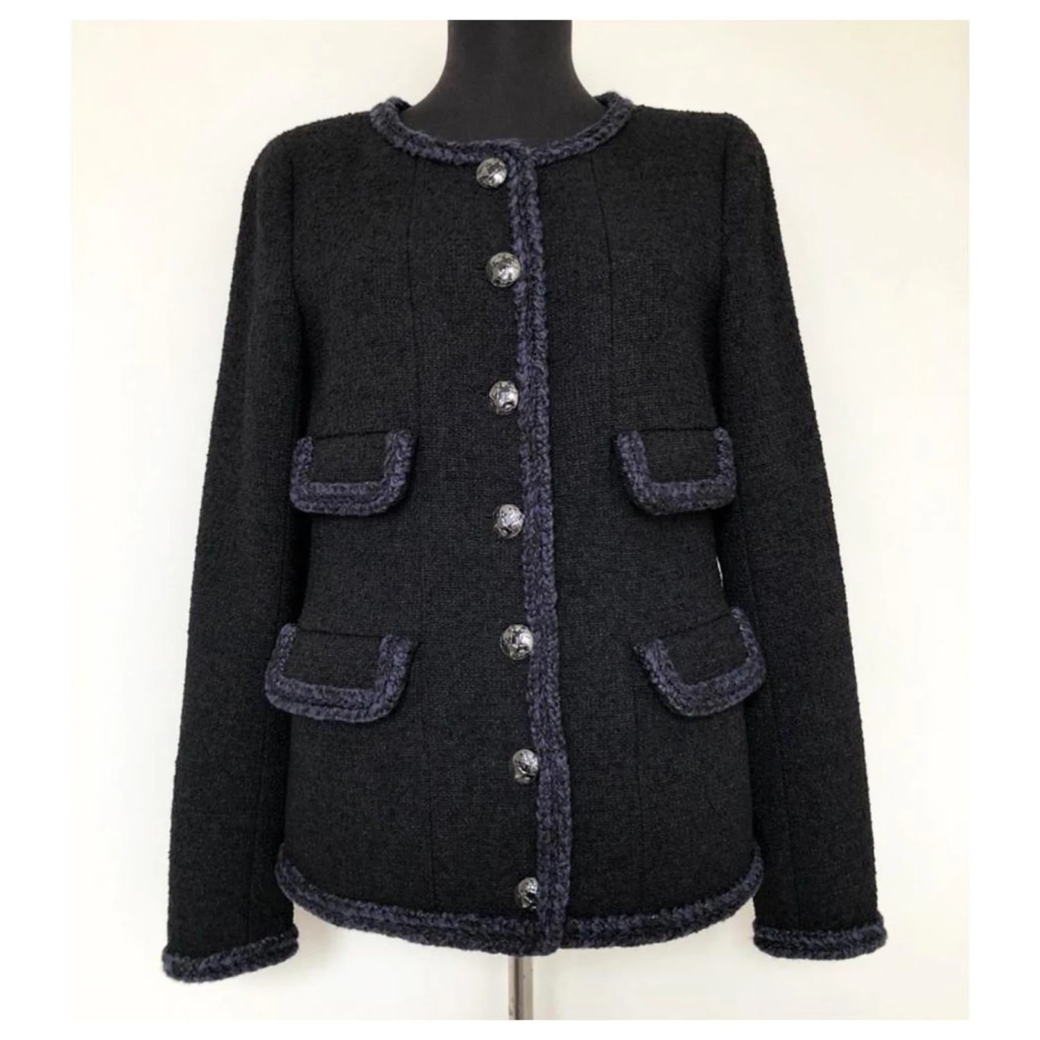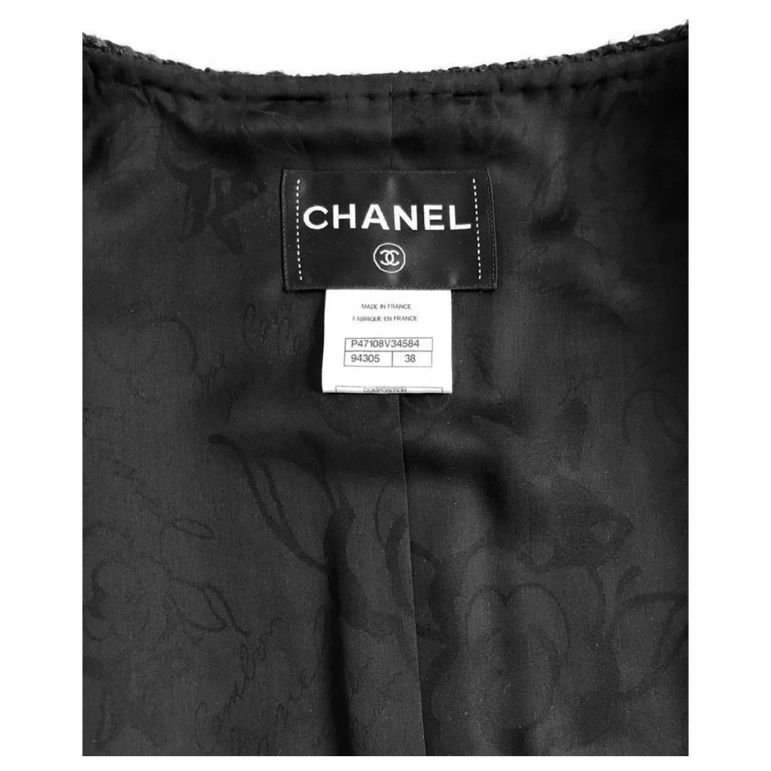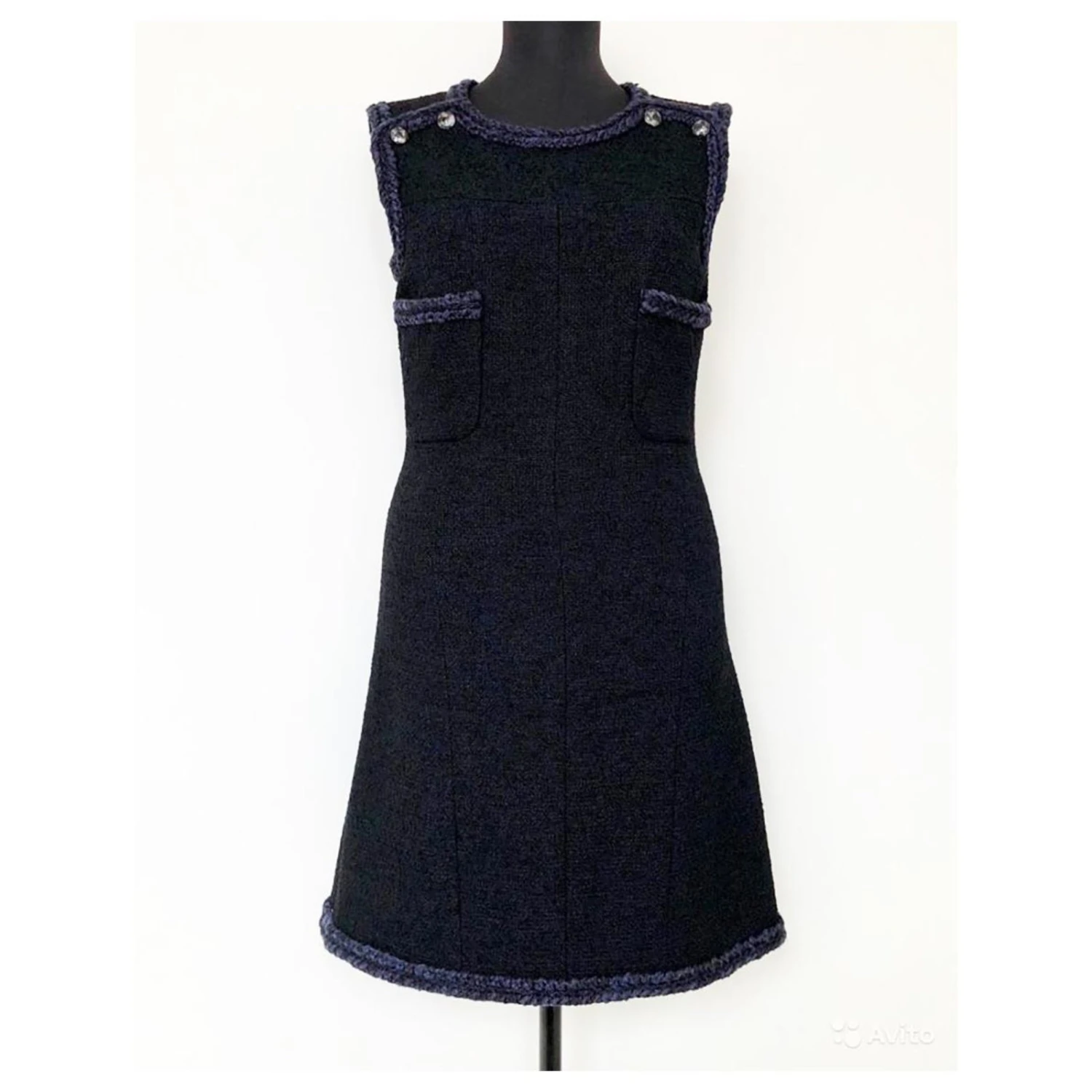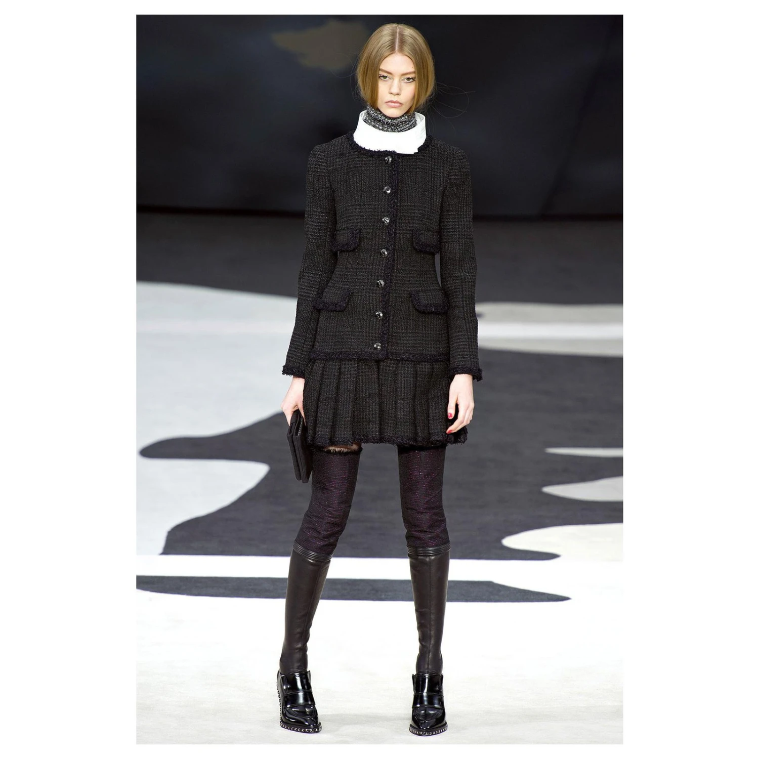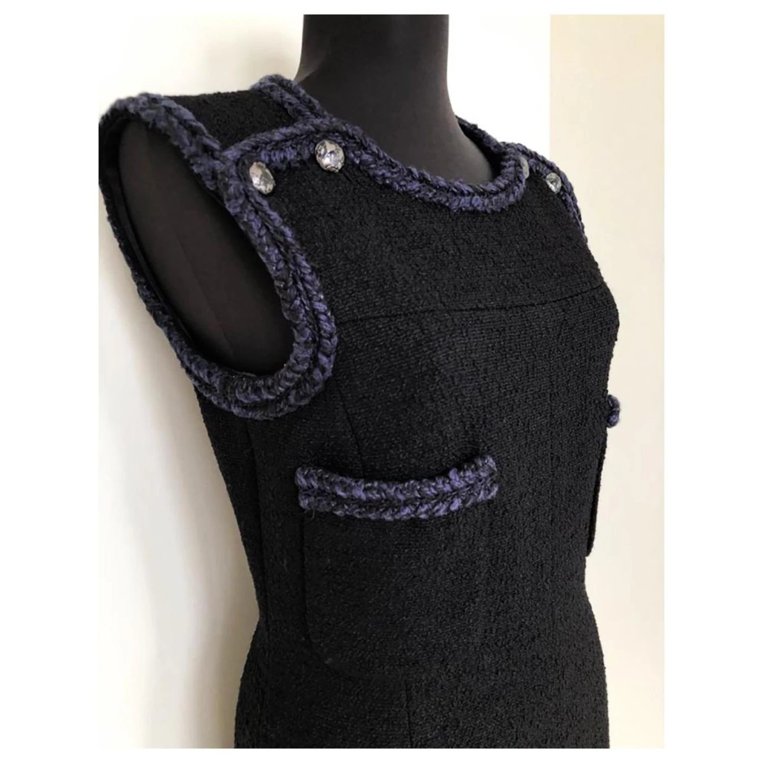 Superbe tailleur en tweed Chanel composĂ© d’une veste et d’une robe. DĂ©tail total des deux ca. 11,000$ (Veste 6,250$ + taxes, Robe 4,600$). PrĂ©sentĂ© dans de nombreuses publicitĂ©s dans les magazines. Vu sur Alexa Chung et d’autres cĂ©lĂ©britĂ©s.Il suit l’emblĂ©matique, silhouette Coco intemporelle ponctuĂ©e de quatre poches et de bordures tressĂ©es sur les poches et les ourlets d’une nuance contrastĂ©e de marine. Karl Lagerfeld est un vrai maĂ®tre de la crĂ©ation d’un look chic en noir et bleu. Et n’oublions pas les boutons.