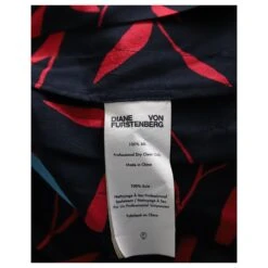Superbe robe en soie noire et rouge de Diane von Furstenberg dans un style kimono, c’est une robe portefeuille mais au lieu d’ĂŞtre attachĂ©e, il y a une fermeture Ă crochet et Ă oeil et un bouton Ă l’intĂ©rieur, le motif est japonais, les manches se terminent par des poignets bleu marine uni assortis Ă l’encolure avant.
