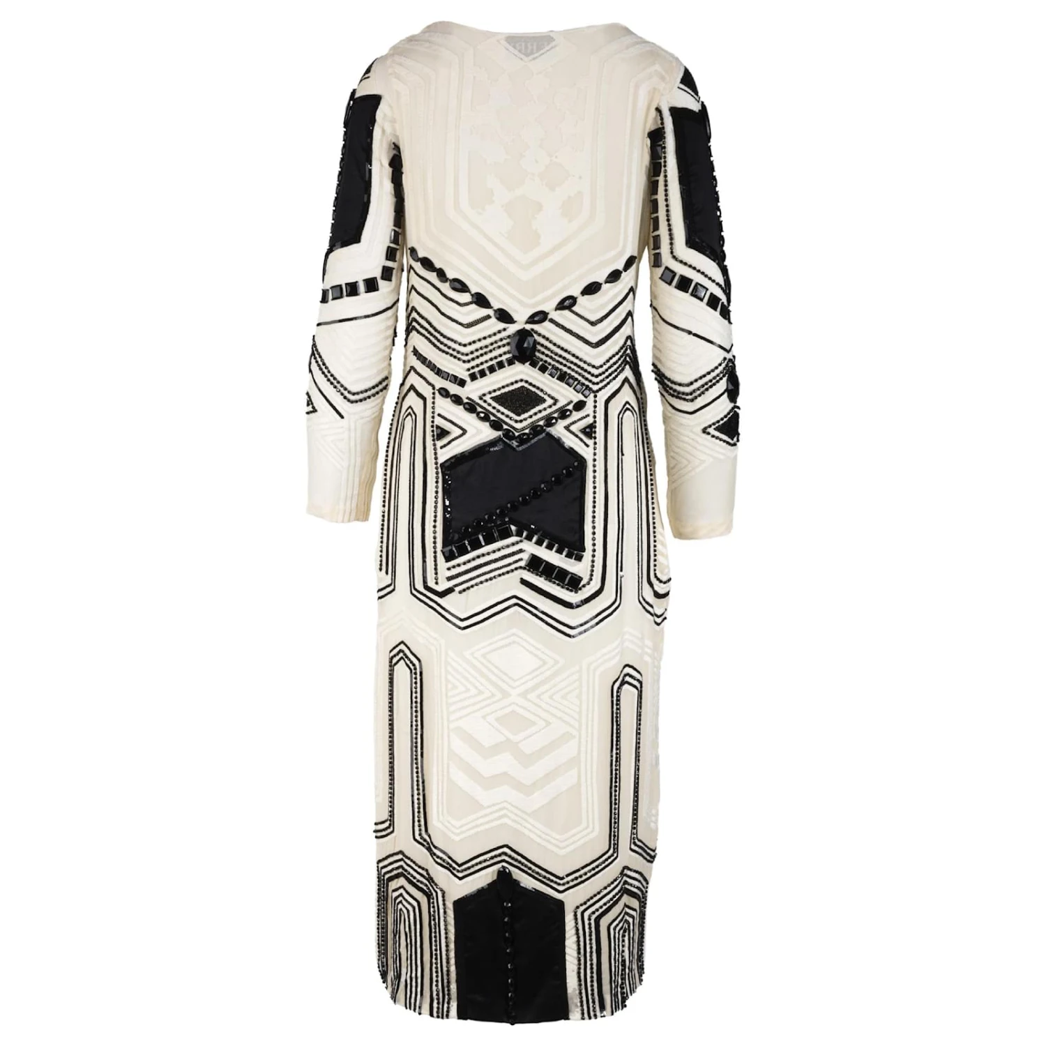 Gianfranco Ferré ’90robe en soie de couleur crème, agrémenté de broderies géométriques et de cristaux synthétiques à facettes de différentes formes et de sequins noirs. Longueur midi avec manches trois-quarts et décolleté profond.