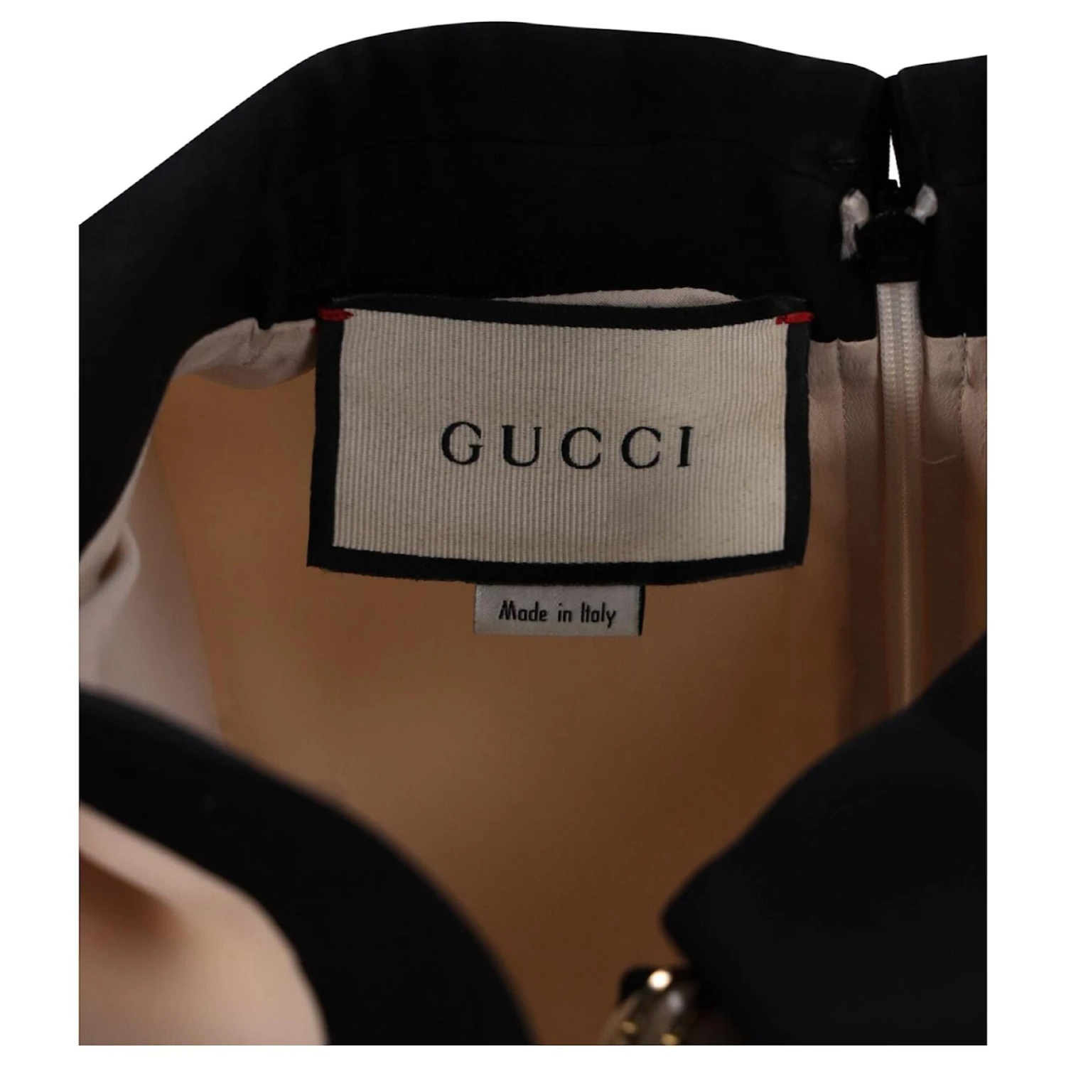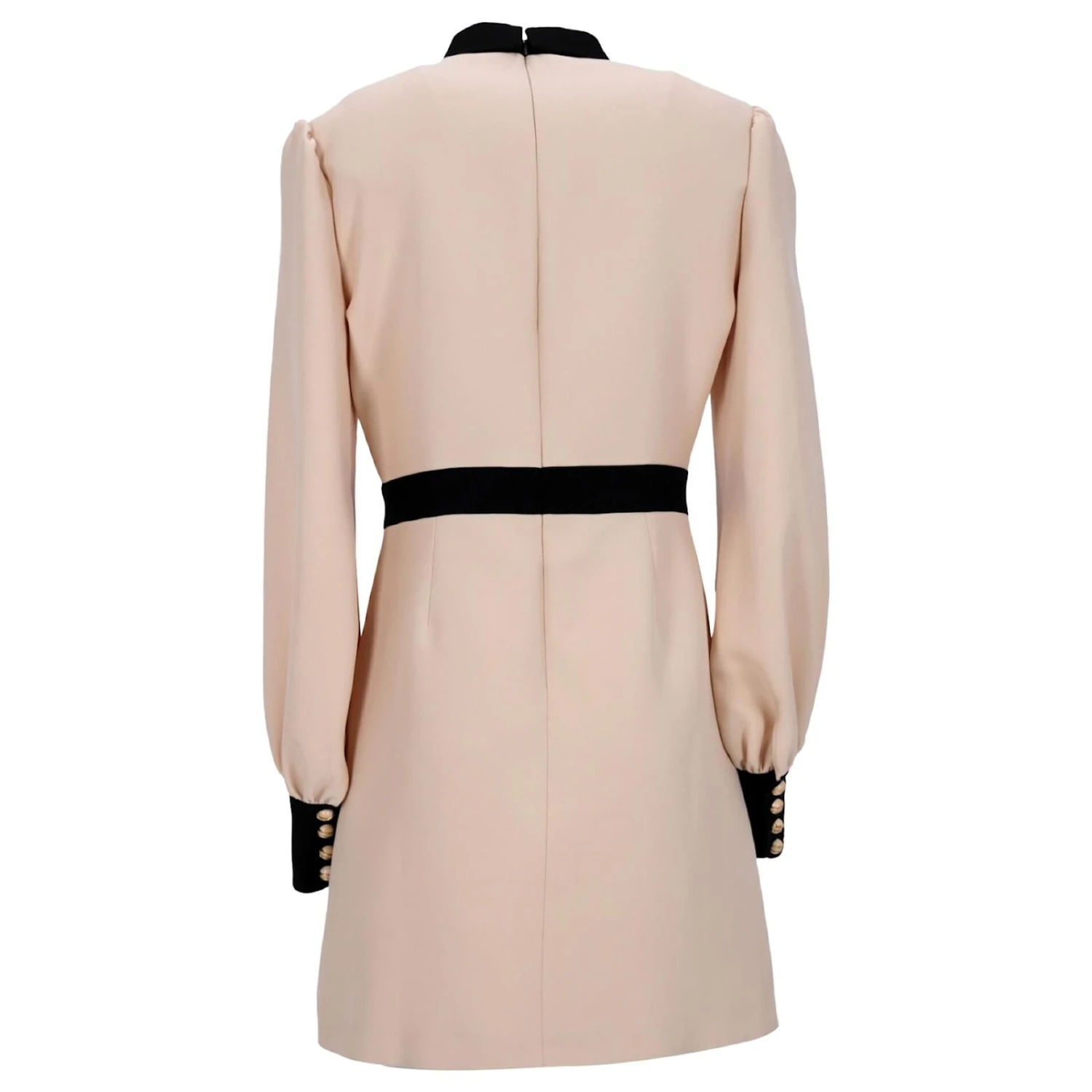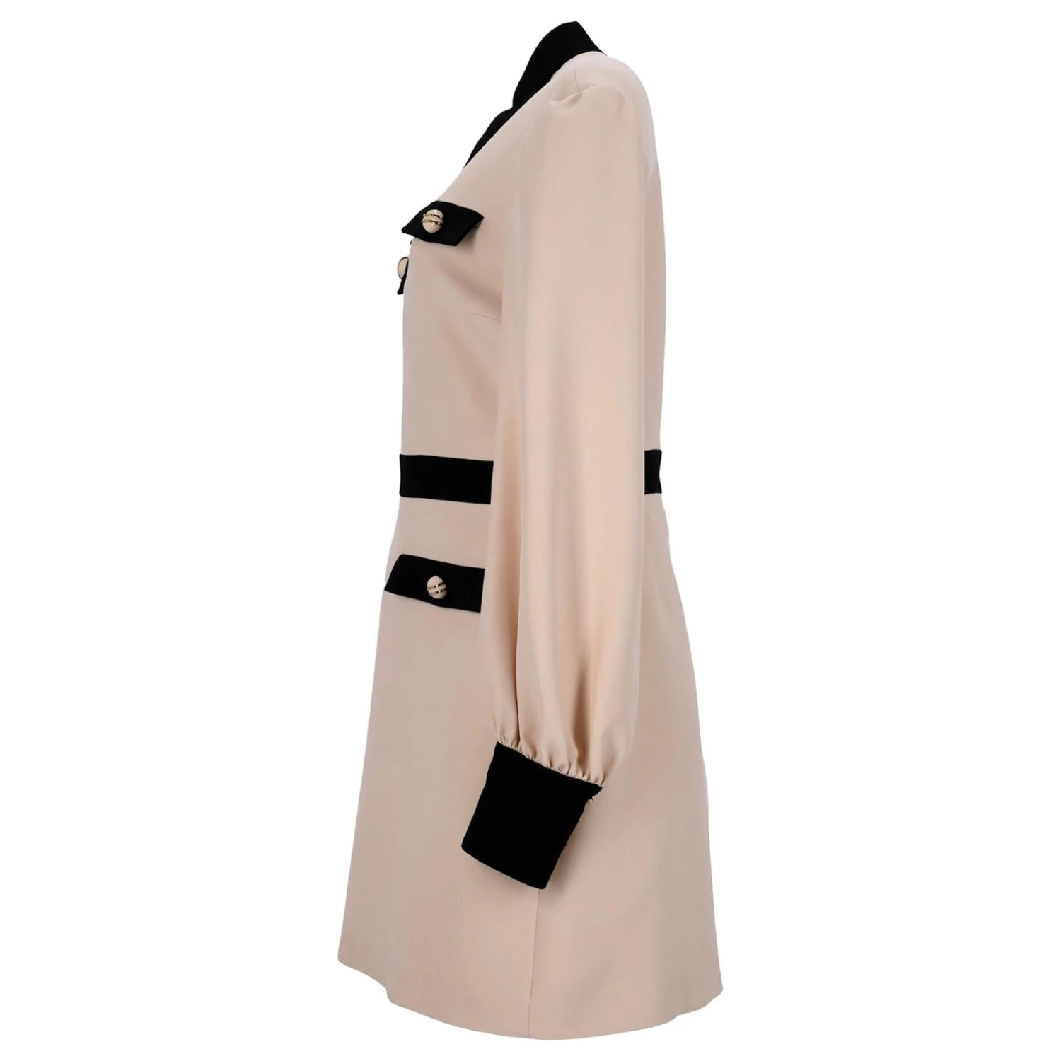Plongez dans le monde de Gucci avec cette mini-robe à manches longues et bordures contrastantes. Coupé dans un riche tissu acrylique crème, cette pièce présente des manches longues et un col classique.