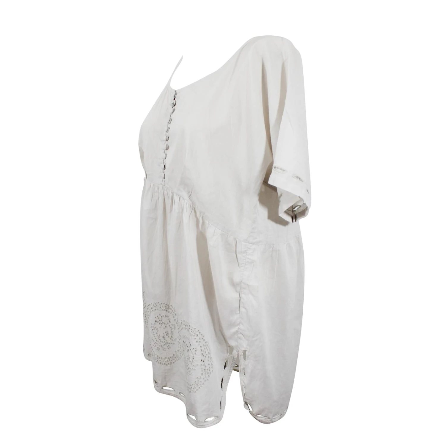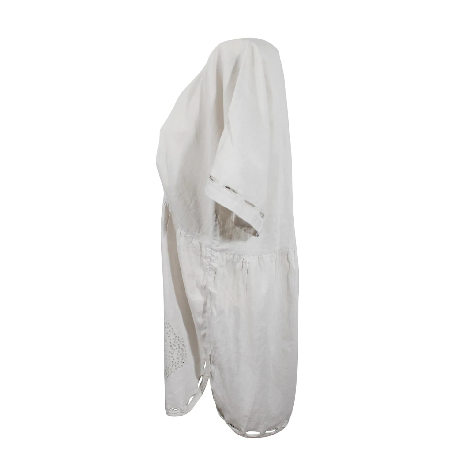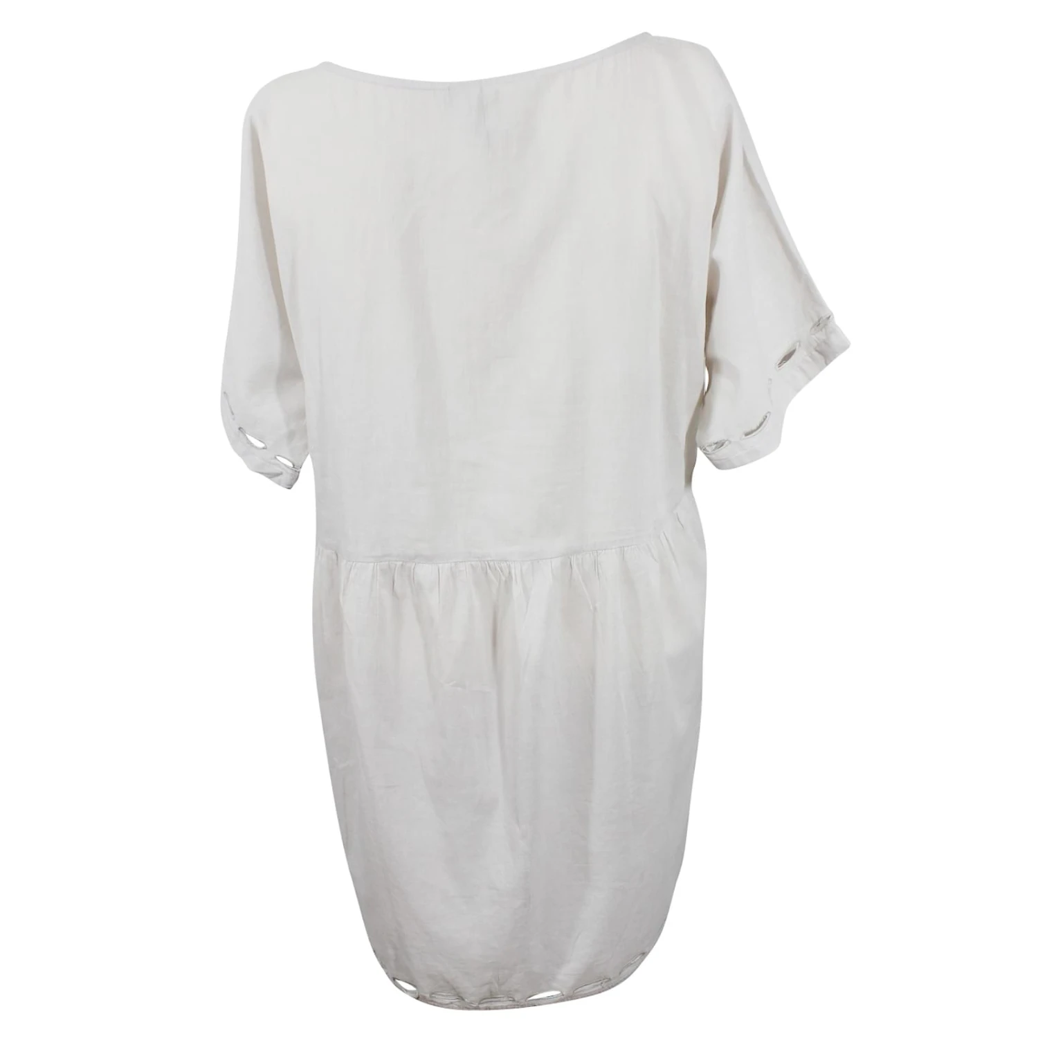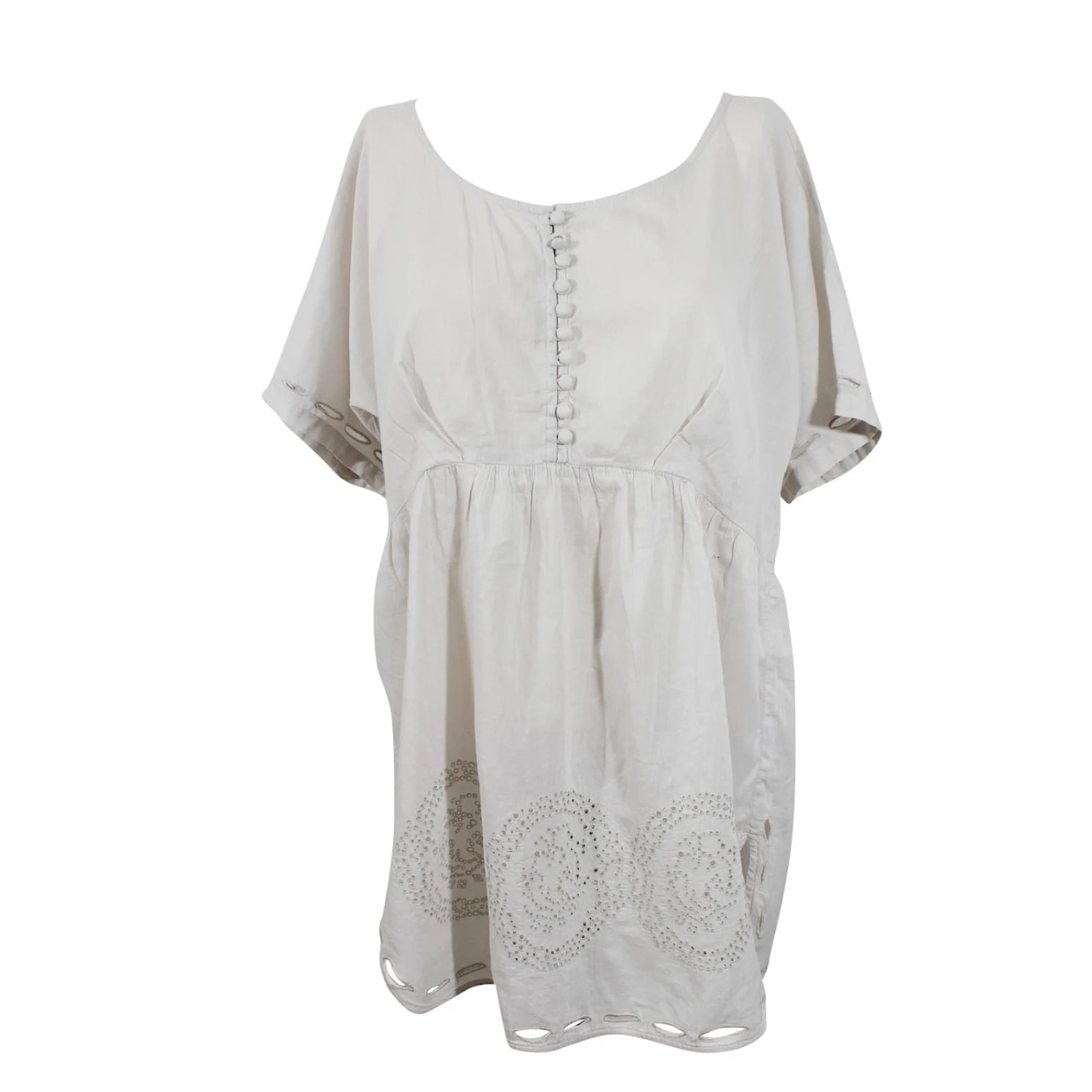 Robe tunique en coton léger couleur gris clair. Taille 0. Dimensions : largeur poitrine 53 cm; longueur 80 cm. Très bon état, juste à signaler un infime trou invisible entre les deux détails ajourés.