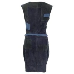 size 42 français.& nbsp;Robe courte en daim stretch marine avec patchwork bleu bleuet et noir. Il a un col en V, manches courtes et ceinture bleue amovible avec boucle argentĂ©e. Le dos de la robe a aussi un patwork mais majoritairement en marine et noir.zippĂ© Ă l’arrière.Non doublĂ©.En tissu: 100% peau d’agneau, 97% cotton, 3% Lycra.Longueur Ă©paule Ă ourlet : 89cm.
