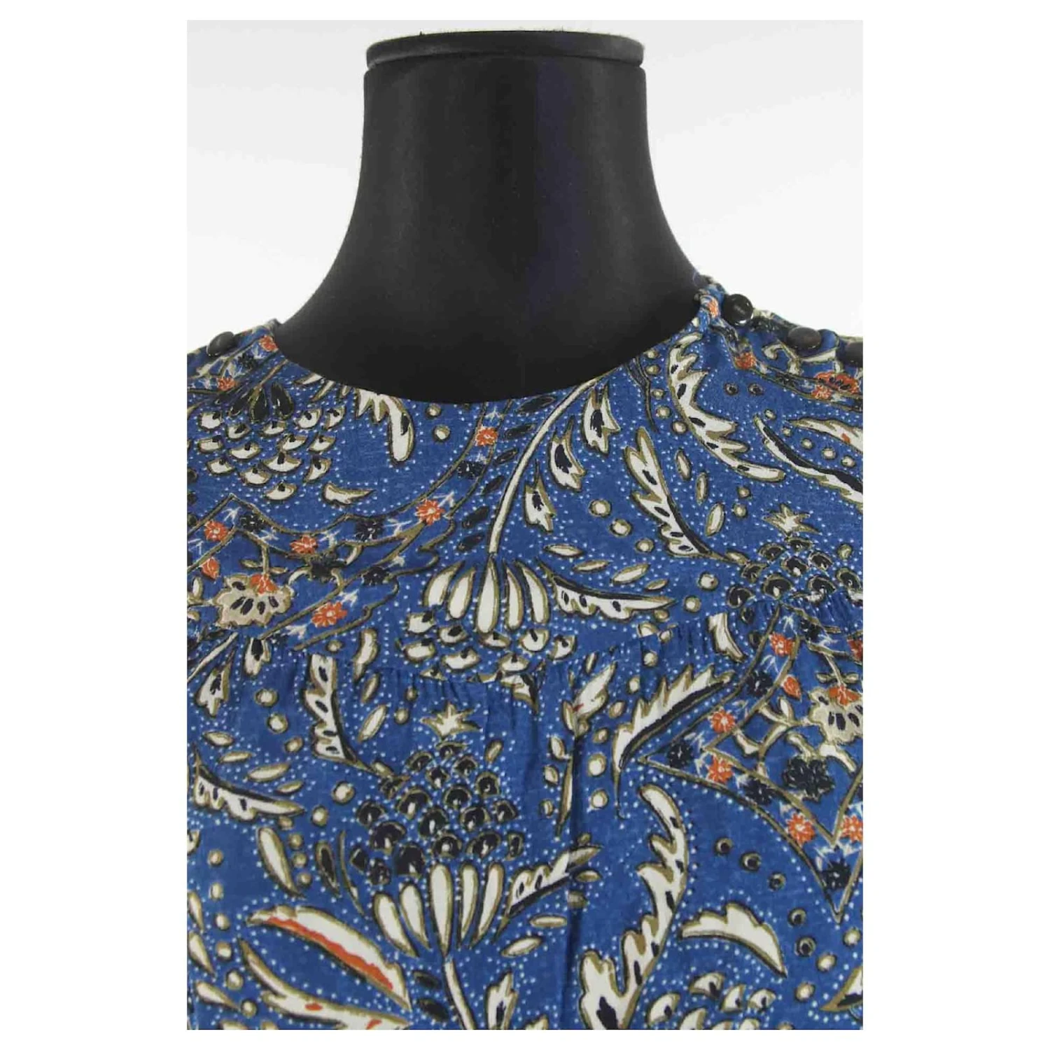 Robe – Sézane – Longueur : 89cm – Épaules : 38cm – Aisselles : 67cm – Imprimé floral – Bleu – Taille XS – 100% Viscose – Très Bon État – Référence 1203003