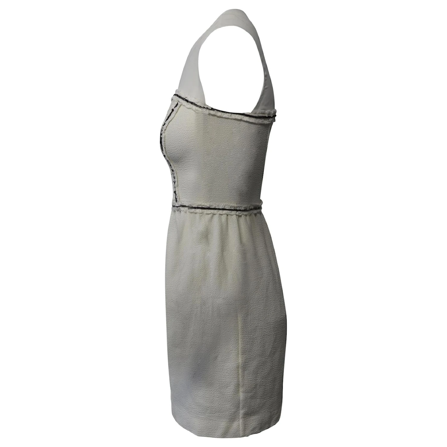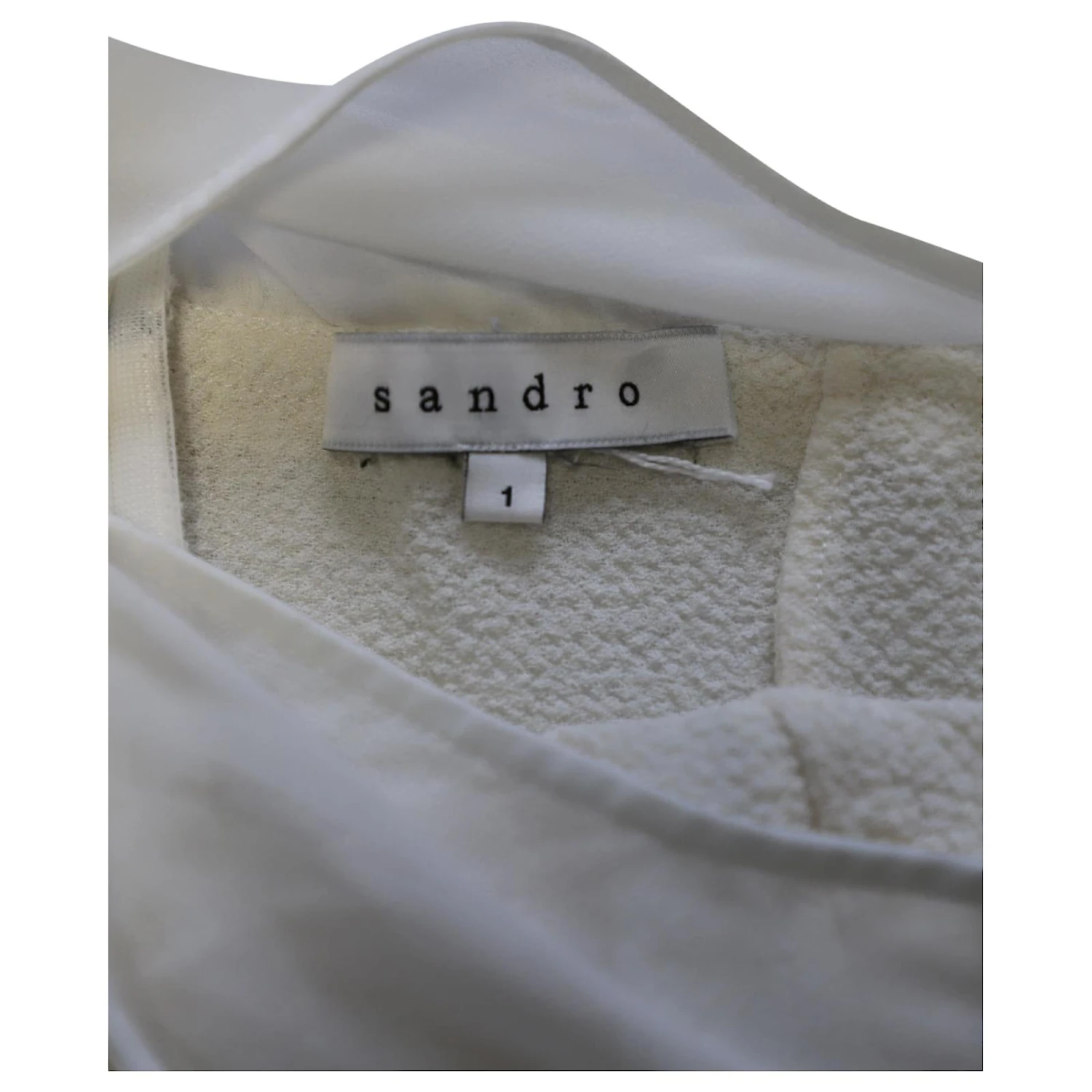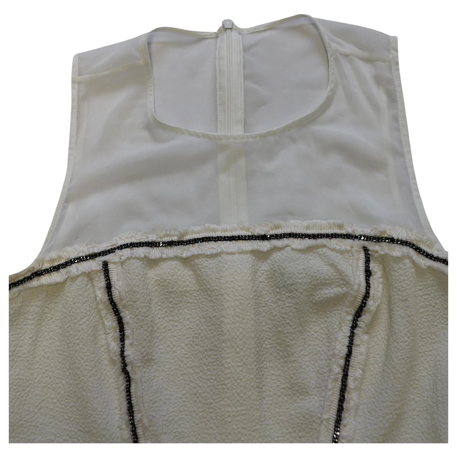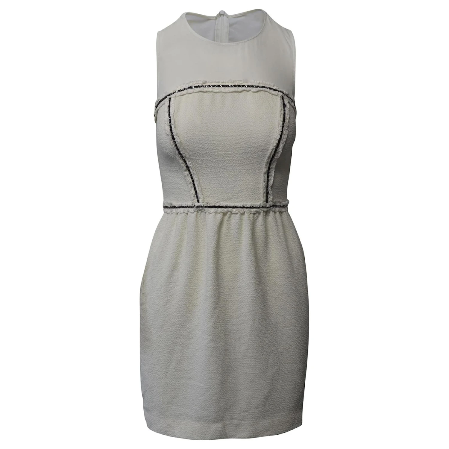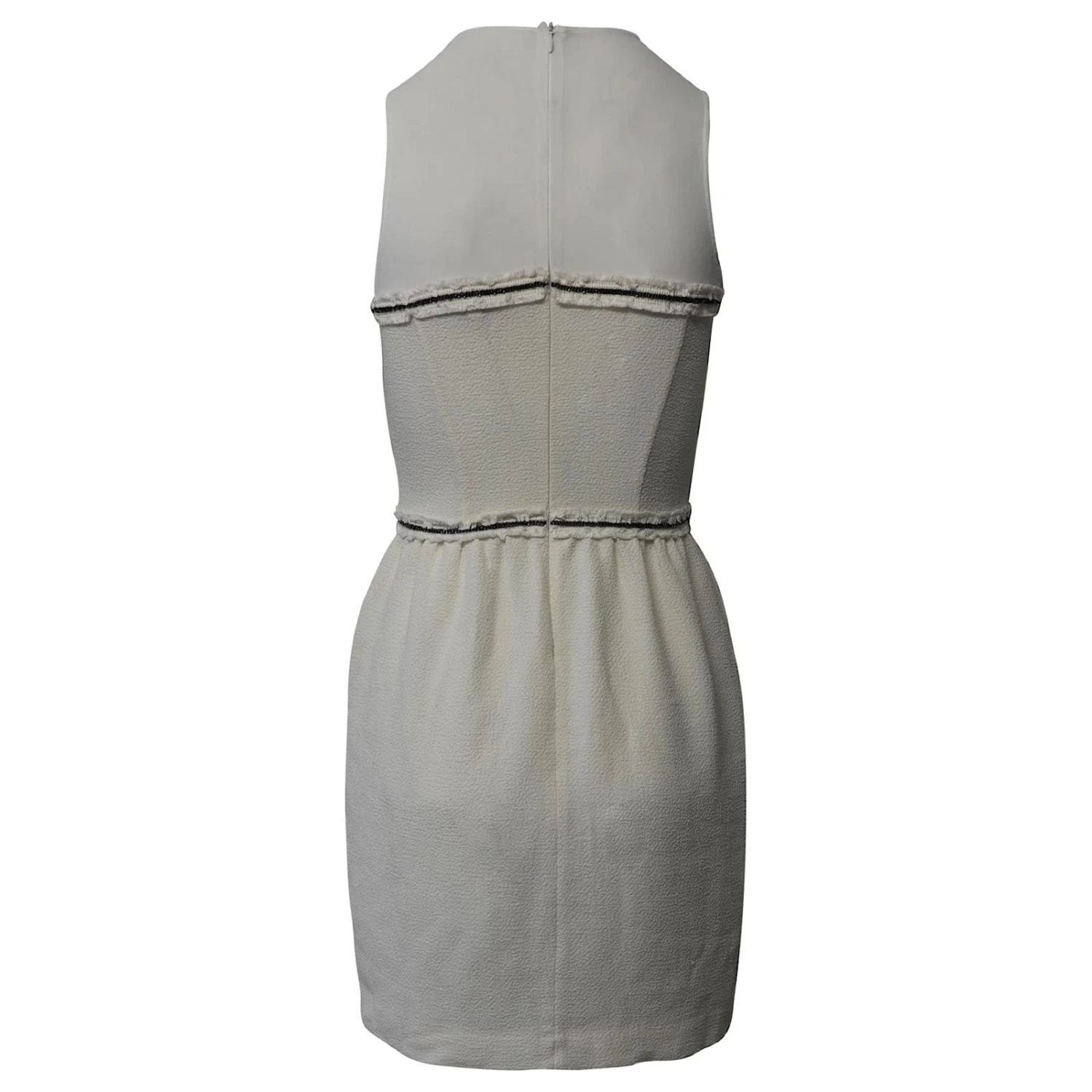 Cette robe fourreau de Sandro Paris est magnifique et confectionnée à partir de matière texturée et de maille. Il a une belle nuance de crème et est stylisé avec une silhouette ajustée, sans manche, et un décolleté simple.